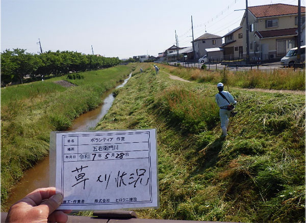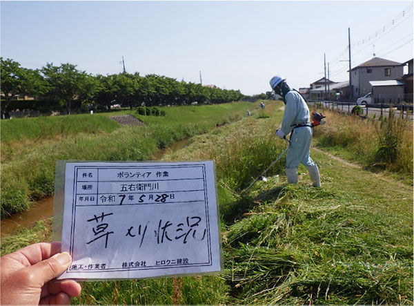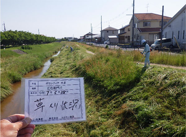 毎年5月と8月にボランティア活動として、会社近くの五右衛門川の草刈りをしています。